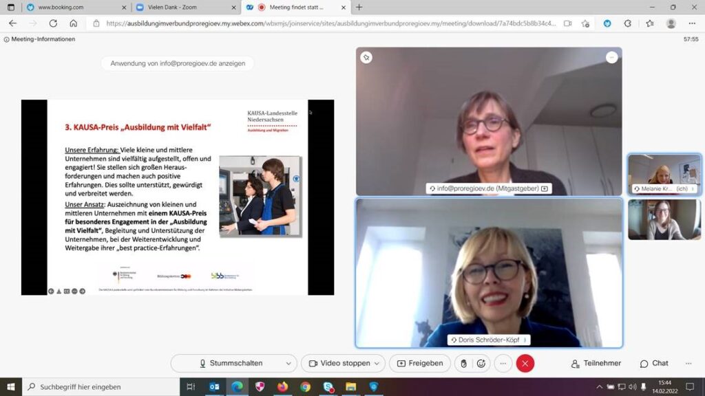 Am 14.02.2022 trafen sich Dina de Haas und Yvonne Salewski von der KAUSA-Servicestelle digital mit der Landesbeauftragten für Migration und Teilhabe, Doris Schröder-Köpf. Dabei gab KAUSA Einblicke in Ihre Arbeit rund um die Frage: Wie können wir erfolgreich interkulturell ausbilden? KAUSA-Servicestellen wenden sich insbesondere an Unternehmerinnen und Unternehmer mit Migrationshintergrund. Sie sind erste Anlaufstellen, um […]