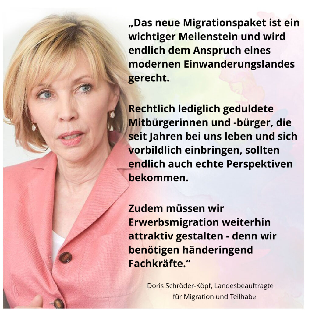 Der von der Ampelkoalition auf den Weg gebrachte Gesetzentwurf zum ersten Migrationspaket, der heute vom Kabinett beschlossen werden soll, widmet sich unter anderem den Themen Duldungen sowie Erwerbsmigration. Die Niedersächsische Landesbeauftragte für Migration und Teilhabe, Doris Schröder-Köpf, begrüßt die vorgesehenen Anpassungen ausdrücklich: „Das neue Migrationspaket ist ein Meilenstein und wird endlich dem Anspruch eines modernen […]