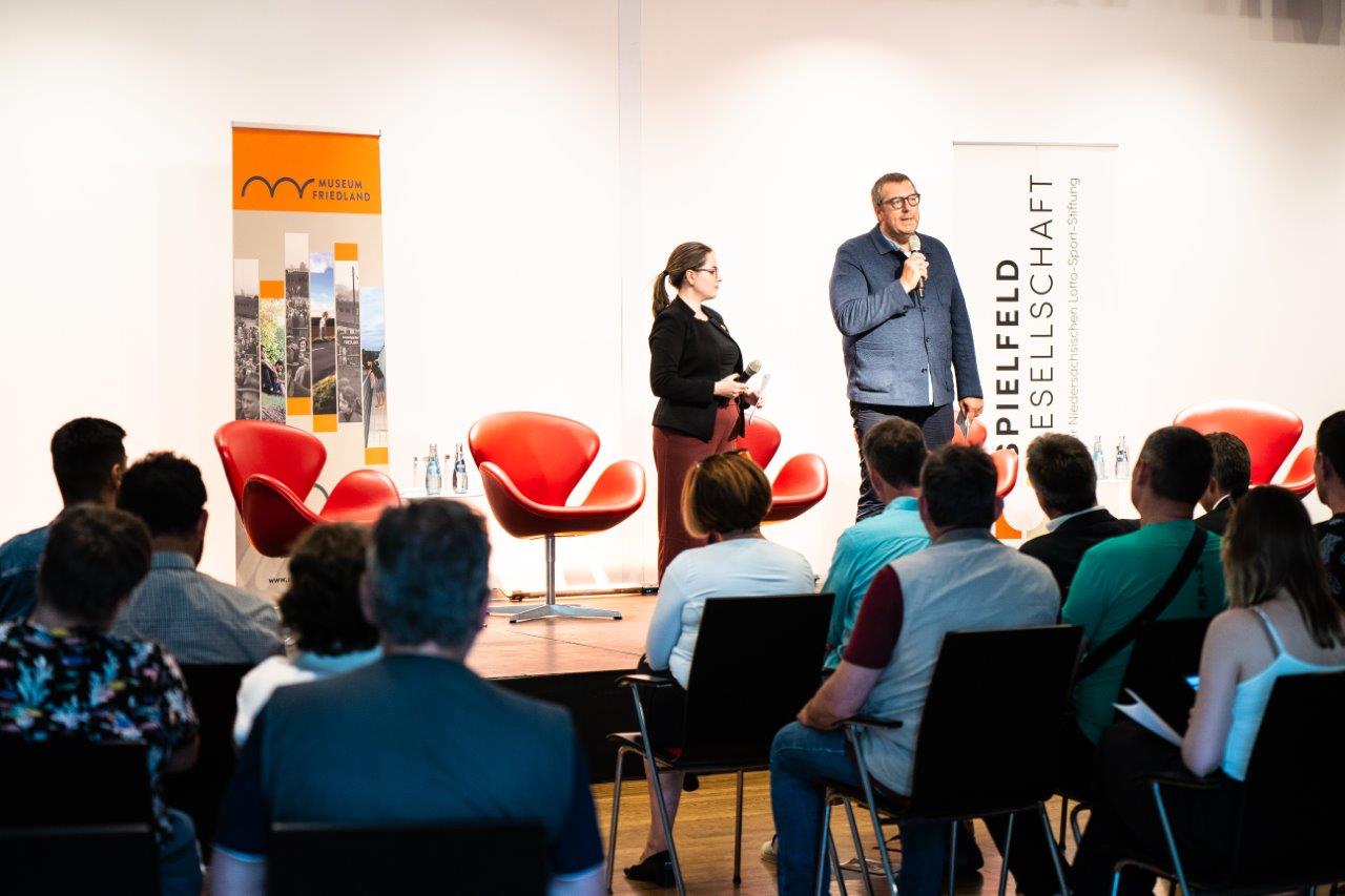 Abschlussveranstaltung der in 2021 begonnenen Veranstaltungsreihe „Fluchtpunkt Niedersachsen: Erzählen von Abschied, Ankunft und Neubeginn“ in der Niedersächsischen Landesvertretung in Berlin: An mehreren Veranstaltungsorten über ganz Niedersachsen verteilt tauschten sich in den vergangenen drei Jahren Zeitzeuginnen und Zeitzeugen zum Thema Flucht und Vertreibung aus. Dabei ging es vor allem um das Ankommen und den damit verbundenen Herausforderungen in der neuen Heimat. Zu der Veranstaltung hatten der Niedersächsische Landesbeauftragte für Migration und Teilhabe, Deniz Kurku, gemeinsam mit dem Museum Friedland sowie der Lotto-Sport-Stiftung (Spielfeld Gesellschaft) eingeladen.