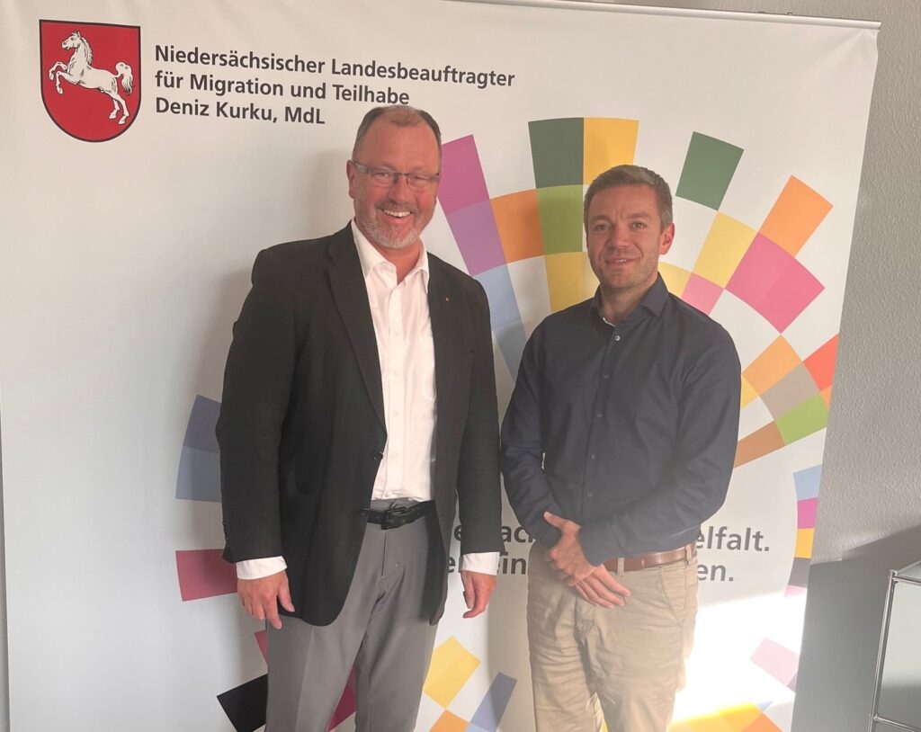 Der Landesbeauftragte im Gespräch mit dem Pfarrer Christoph Lindner. Am 19.09.2023 besuchte Herr Pfarrer Lindner den Landesbeauftragten für Migration und Teilhabe Deniz Kurku in seinem Verbindungsbüro in der Staatskanzlei. Herr Lindner ist Pfarrer in der Kirchengemeinde St. Raphael in Garbsen. Außerdem ist er Konsistorialrat der Visitatur Breslau und für das Bistum Hildesheim zuständig als Beauftragter […]