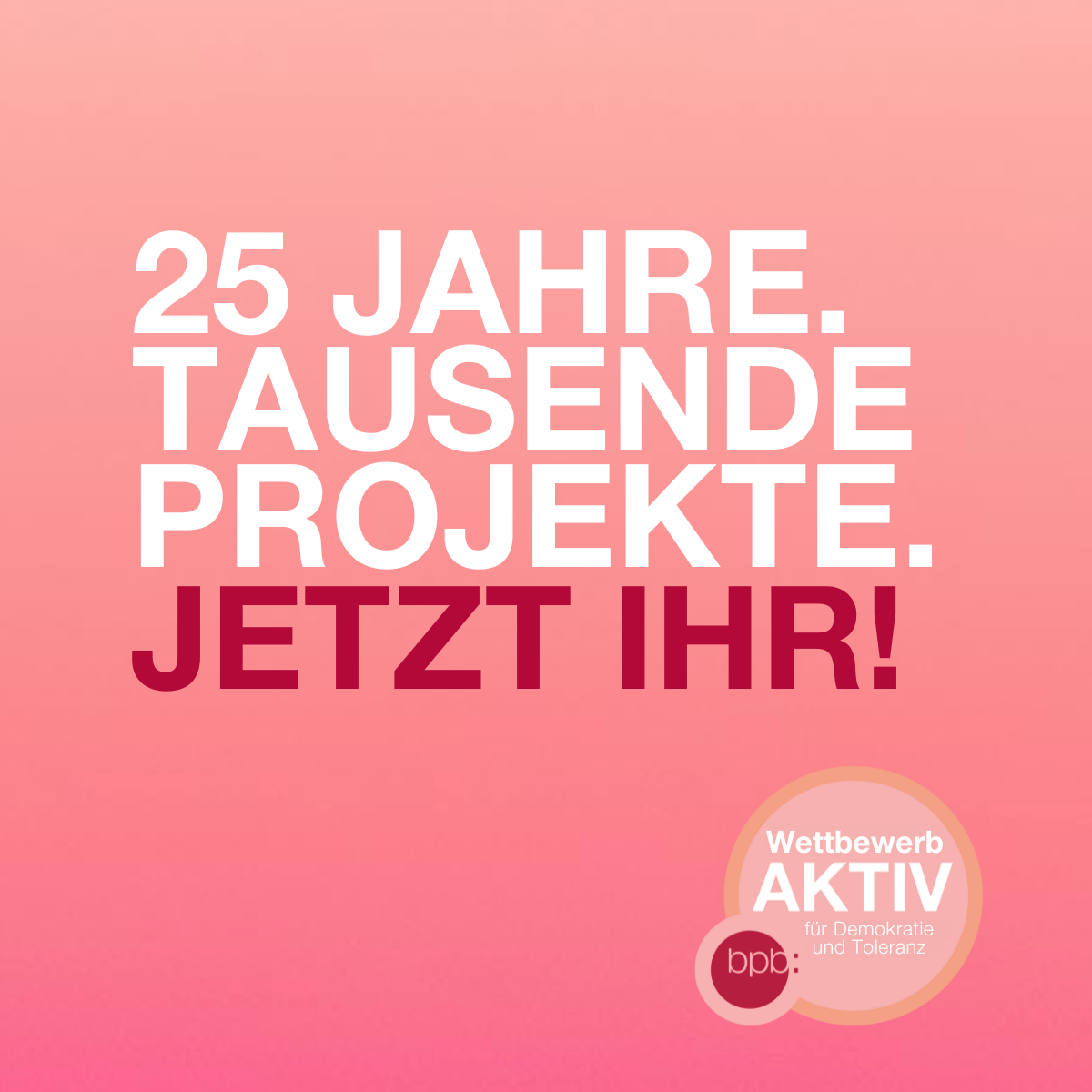 Anlässlich des 25-jährigen Jubiläums des Aktiv-Wettbewerbs werden im Sinne des Entstehungsgedankens in diesem Jahr insbesondere Projekte, die gegen Rechtsextremismus, Antisemitismus und Rassismus kämpfen, gesucht.