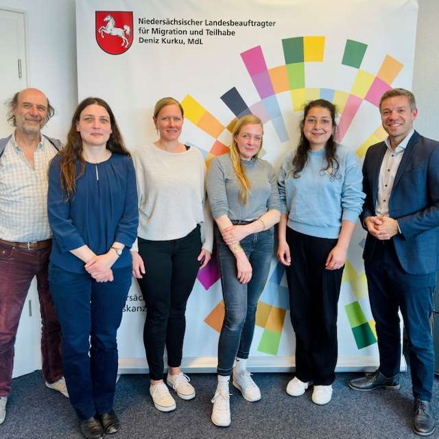 Der Landesbeauftragte für Migration und Teilhabe im Austausch mit Vertreterinnen und Vertretern der unabhängigen Fachberatung, die von kargah e.V. und IBIS e.V. zu Eingaben an die Niedersächsische Härtefallkommission geleistet wird. Im Mittelpunkt des angeregten Gesprächs in der Staatskanzlei standen aktuelle Herausforderungen der Beratungspraxis – etwa infolge des Ukrainekriegs oder der Aufhebung des Ausreisestopps für irakische Staatsangehörige.