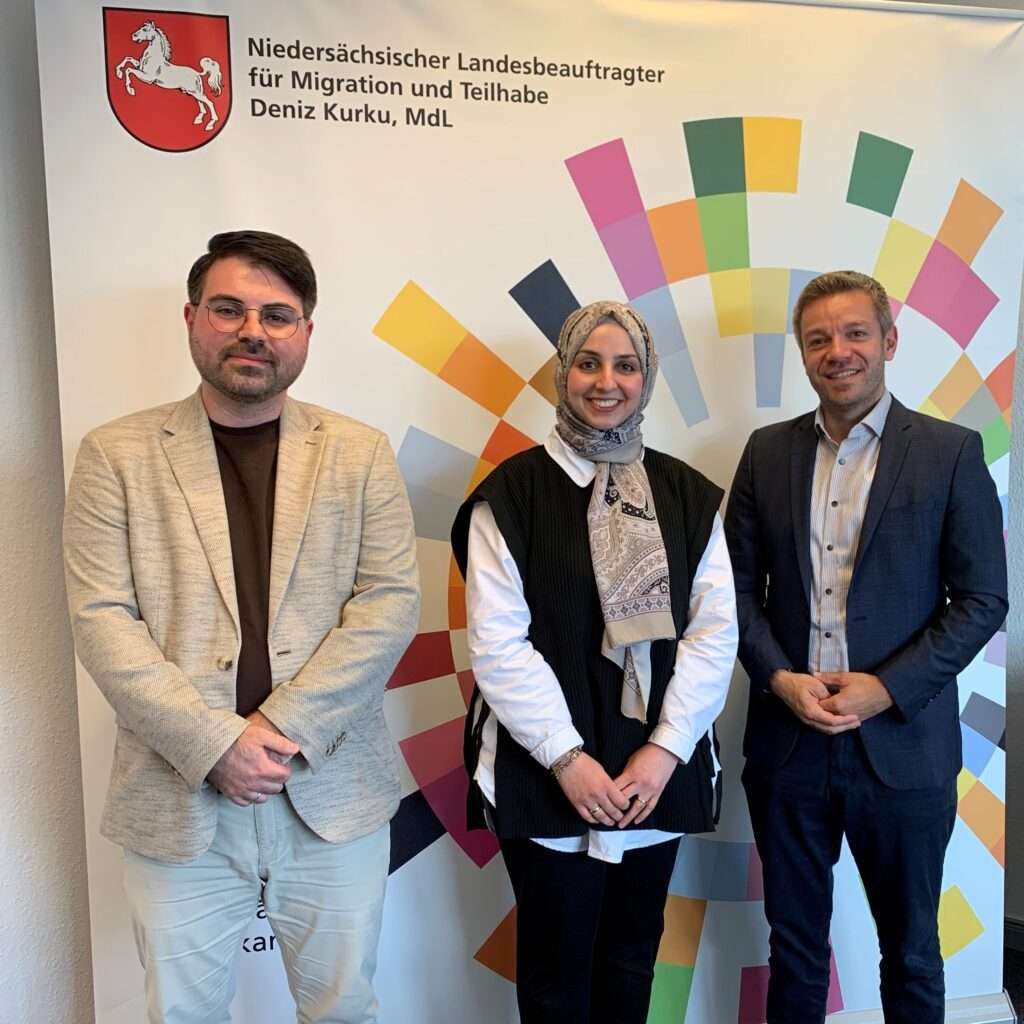 Deniz Kurku bedankt sich bei Sümeyra Yavaş und Mehmet Akif Dökmetaş für den vertrauensvollen Austausch zu ihrer Tätigkeit als islamische Seelsorgende. Beide stehen im Niedersächsischen Justizvollzug und im Arrest Inhaftierten und ihren Familien zur Seite. Dabei sind sie nicht nur für muslimische Gläubige, sondern religionsübergreifend ansprechbar und arbeiten eng mit christlichen Kolleginnen und Kollegen zusammen.